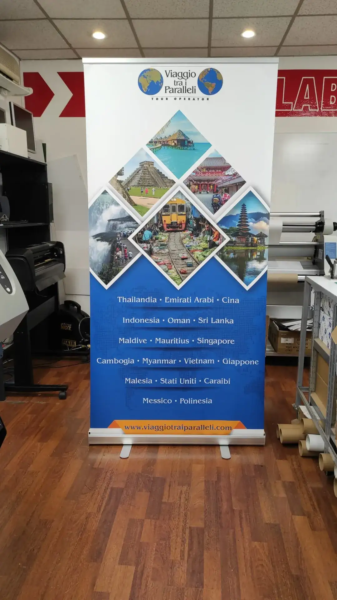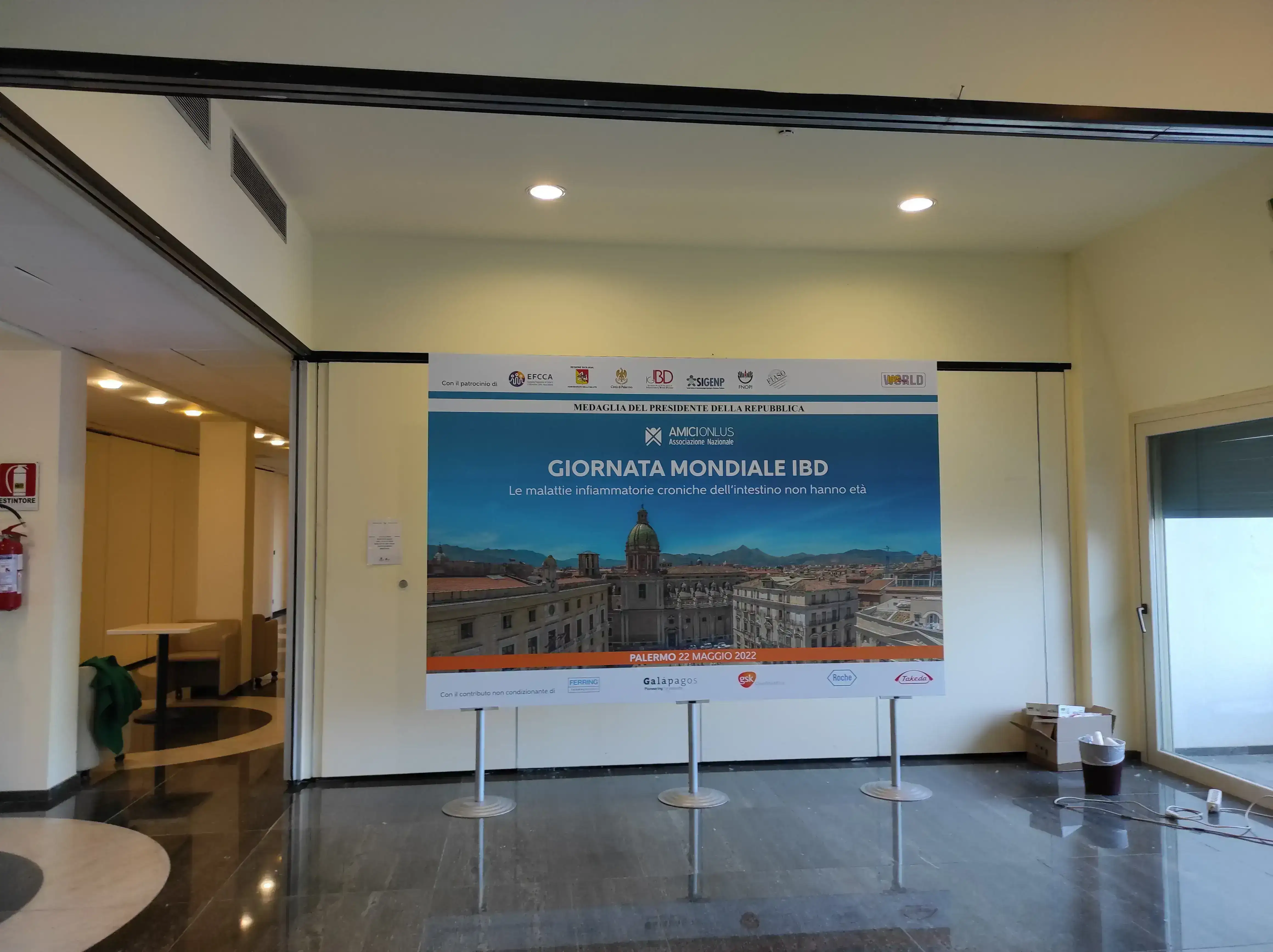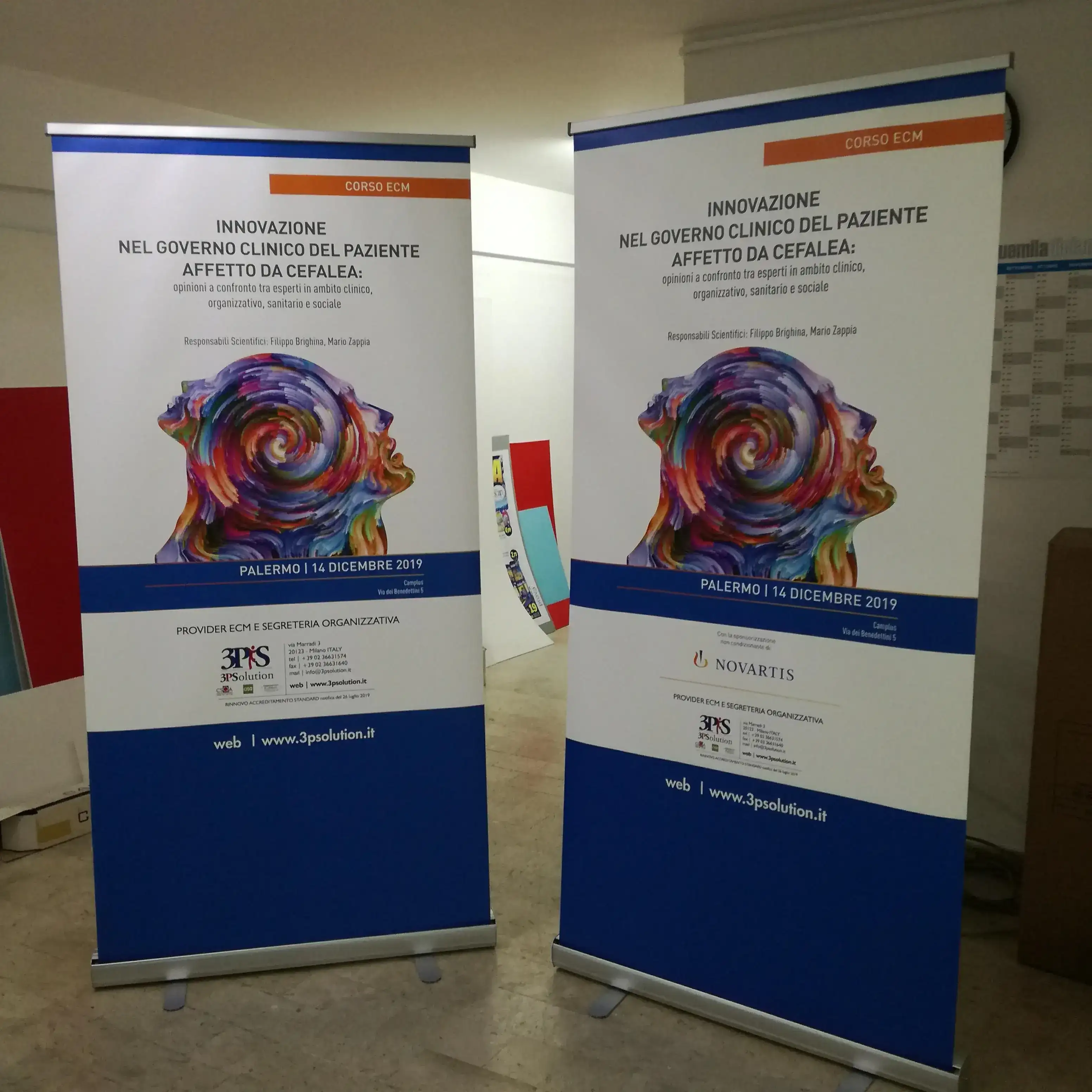 - Banner, Roll-up e Fondali: Per personalizzare il palco dei relatori, le aree di registrazione e gli spazi espositivi.
