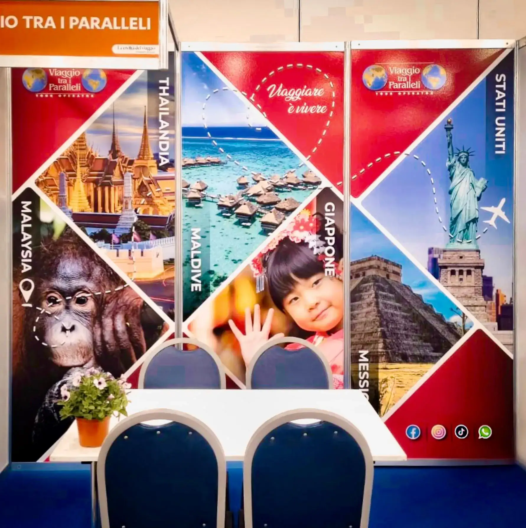 - Grafiche per Desk e Banchetti: Rivestimenti adesivi o pannelli rigidi per brandizzare i punti di accoglienza e informazione.